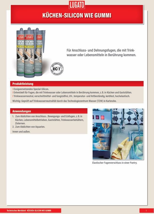 Silikon - Für Fugen mit Kontakt zu Trinkwasser und Lebensmitteln - auch für Aquarien - Geprüft auf Trinkwasserverträglichkeit Artikel-Nr.: 88619500 Hersteller: LUGATO GmbH & Co. KG Grundpreis: € 5,51/ 100 ml