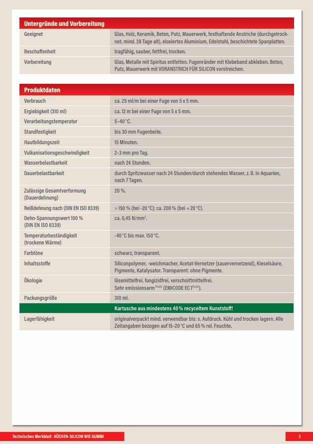 - Entwickelt für Fugen, die mit Trinkwasser oder Lebensmitteln in Berührung kommen, z. B. in Küchen und Gaststätten.