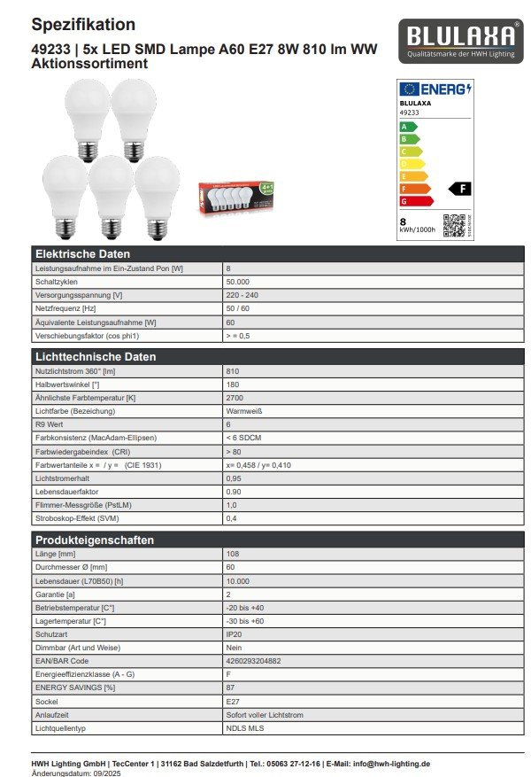 Shop » Detailansicht BLULAXA LED SMD Lampe Birnenform - E27 8W 810 lm - warmweiß - 5er Packung