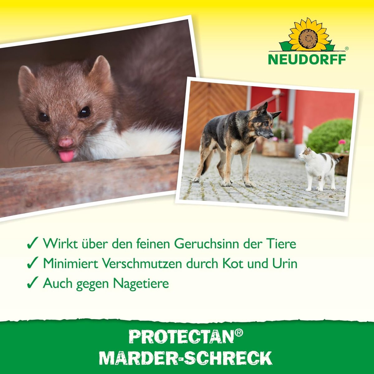 Protectan Marder-Schreck ist ein Fernhaltemittel gegen Marder. Die Wirkung beruht auf den für die Tiere unangenehmen Geruchs- und Geschmackstoffen.