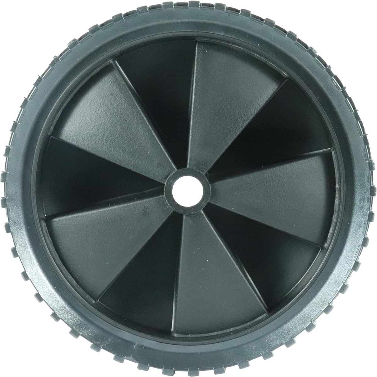 Leichtes Rad mit schwarzer Kunststofffelge, Gleitlager und Stollenprofil.