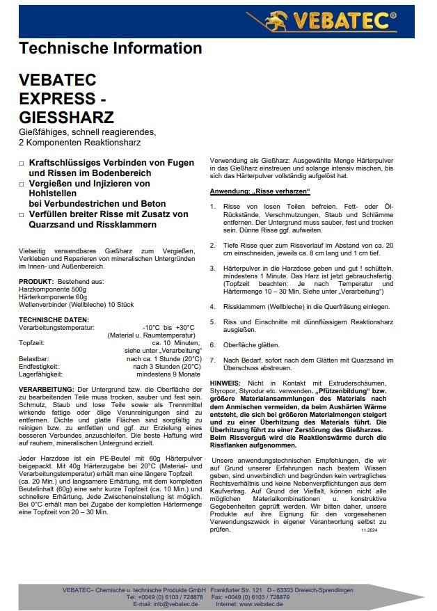 Vielseitiges, sehr schnell reagierendes Gießharz-System, zum Vergießen, Verkleben und Reparieren von mineralischen Untergründen im Innen- und Außenbereich.
