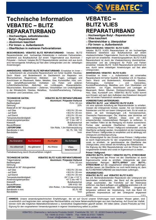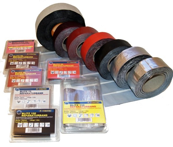 Vebatec Blitz Reparaturbänder sind hochwertige Klebebänder in 6 Farbvarianten, bestehend aus Butylkautschuk auf einem Trägermaterial aus Aluminium / Polyester-Verbund. Vebatec Blitz Reparaturbänder zeichnen sich aus durch eine hervorragende Anhaftung auf fast allen Untergründen und die vielseitigen Anwendungen.
