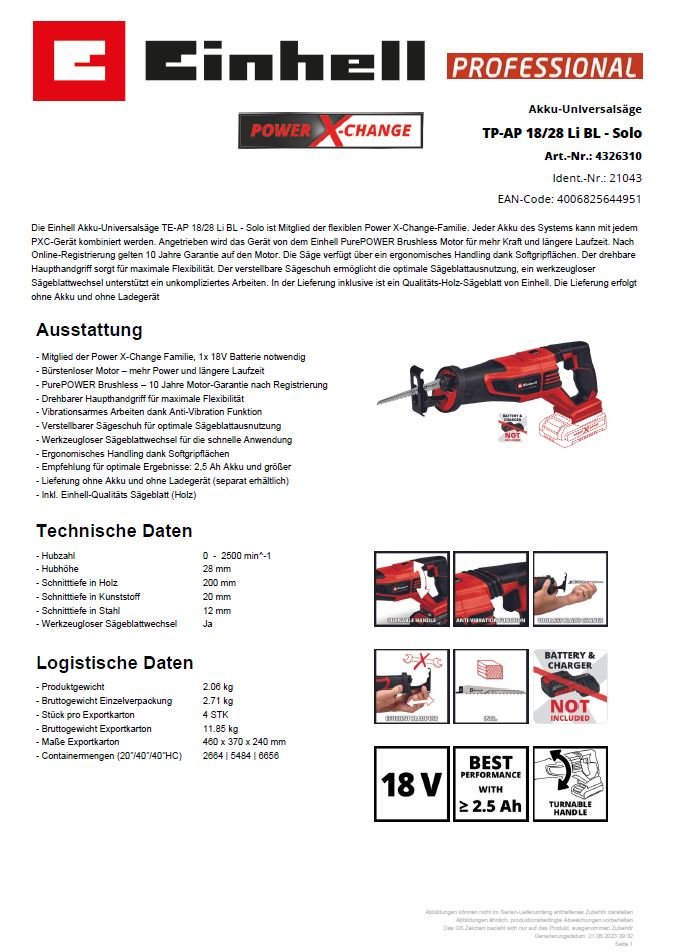 Akkusäge - Universalsäge - Kraftvoll und langlebig - mit Einhell PurePOWER Brushless Motor - Art.Nr.: 4326310 Artikel-Nr.: 85000424 Hersteller: Einhell Germany AG