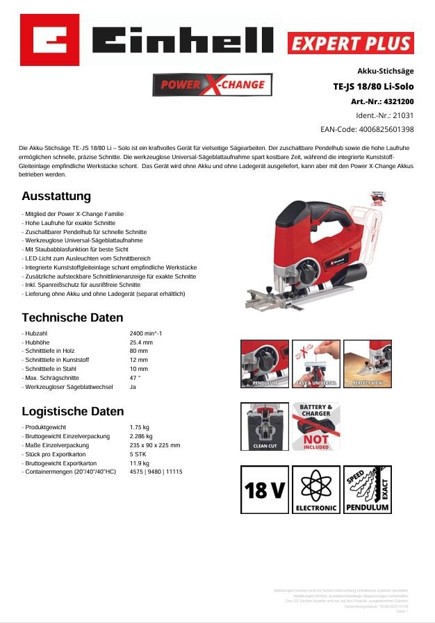 Akkusäge - Stichsäge - Art.Nr.: 4321200 Artikel-Nr.: 85100017 Hersteller: Einhell Germany AG